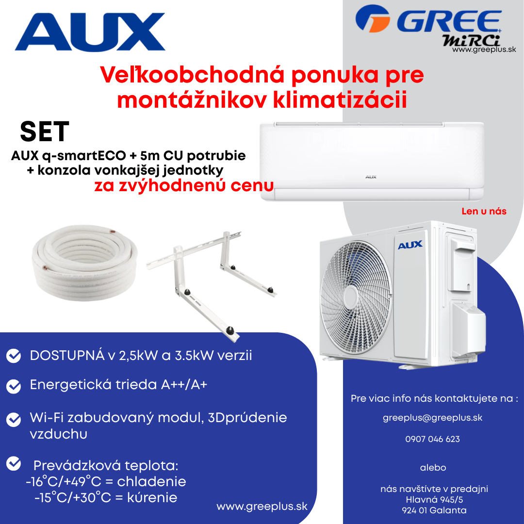 Pre sezónu 2026 je pripravená zvýhodnená veľkoobchodná ponuka montážneho setu klimatizácie AUX Q-Smart eco v prevedení 2,5 kW alebo 3,5 kW. Súčasťou setu je 5 m medeného potrubia (CU) a konzoly vonkajšej jednotky už v cene.